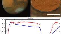 The red colour of Mars has long been attributed to the occurrence of ferric oxides on its surface and in atmospheric dust storms. Such a belief has been accentuated by results of Viking Lander experiments on the surface of Mars, which suggested the presence of maghaemite, γ-Fe2O3 (refs 1, 2). This dark brown, ferromagnetic iron (III) oxide phase not only conforms with the colour and magnetic properties of dust on the martian surface, but suggests that maghaemite acted as a catalyst in some of the biological experiments performed in situ on Mars3. Many of the physical properties and chemical reactions attributed to maghaemite, however, are also displayed by δ-FeOOH, an oxide hydroxide polymorph of ferric iron4,5. On Earth, δ-FeOOH occurs as the mineral feroxyhyte in gleyed soils and in submarine manganese nodule deposits6. Some of the properties and paragenetic relationships of feroxyhyte are described here and it is suggested that δ-FeOOH is a prime candidate for the red-brown ferromagnetic phase coating the surface of Mars.