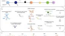 The F420H2:quinone oxidoreductase complex24 is recognized as the main generator of proton-motive force. However, our analysis indicates the presence of heterodisulphide reductase and several molybdopterin-binding oxidoreductases, with polysulphide, nitrate, dimethyl sulphoxide, and thiosulphate as potential substrates, which might contribute to energizing the cell membrane. A. fulgidus contains a large number of flavoproteins, iron–sulphur proteins and iron-binding proteins that contribute to the general intracellular flow of electrons (Fig. 3). Detoxification enzymes include a peroxidase/catalase, an alkyl-hydroperoxide reductase, arsenate reductase, and eight NADH oxidases, presumably catalysing the four-electron reduction of molecular oxygen to water, with the concurrent regeneration of NAD.
