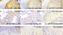 Fixed tissue sections were stained with commercially available antibodies according to the modified ABC method.23, 24 Tissue sections were deparaffinized, rehydrolized, and rinsed in PBS with or without pretreatment by microwave or pepsin-antigen retrieval, as specified for each antibody. The sections were then blocked with 10% horse and goat serum for 15 min to reduce nonspecific background. Primary antibodies CD20 (1:400), CD3 (1:500), CD45 (1:250), Bcl-2 (1:100), cytokeratin AE1/AE3 (1:400), and immunoglobulin kappa and lambda (1:100K) chains were purchased from DAKO, Carpinteria, CA, USA, while CD5 (1:100) was obtained from Vision BioSystems Inc., Norwell, MA, USA, and alpha-methylacyl-CoA racemase (1:200) from Zeta Co., Sierra Madre, CA, USA. As listed in Table 1, for long immunohistochemistry staining, sections were incubated sequentially with primary antibody for 18 h at room temperature, biotinylated secondary antibody for 30 min at 40°C, 0.3% hydrogen peroxide for 5 min at 40°C, and ABC complex for 30 min. Short immunohistochemistry staining was similar to long immunohistochemistry procedures, except that sections were incubated with the primary antibody, secondary antibody, and ABC complex for 10, 5, and 5 min, respectively. Antibody binding sites were visualized using 3,3′-diaminobenzidine as the chromogenic substrate, and tissue sections were lightly counterstained with hematoxylin. Appropriate multitissue controls were used with each reaction as external positive and negative controls. Negative controls for immunohistochemistry reactions used serum to substrate primary antibodies. The quality of immunohistochemistry staining was graded on five scales from (−) to (++++): (−) indicates lack of staining; (+) indicates weak staining in a small percentage of positive cells; (++) indicates weak staining in the majority of positive cells; (+++) indicates moderate staining in the majority of positive cells; and (++++) indicates strong staining in all positive cells.