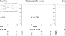 MALT lymphomas occur most often in the stomach, and recently, we systematically analyzed 115 gastric cases.8 As cases positive for API2-MALT1 fusion were totally resistant to H. pylori eradication, we divided the MALT lymphomas into three groups: eradication-responsive and API2-MALT1 fusion-negative (Group A), eradication-resistant and fusion-negative (Group B), and eradication-resistant and fusion-positive (Group C).8 Group A tumors showed superficial gastric wall involvement and a less advanced clinical stage. In contrast, those of Group B and C were often negative for H. pylori infection, and frequently showed a highly advanced clinical stage. A purely low-grade histology was noted in Group C tumors. Some of these features have been reported by other investigators as well.9, 10, 11 These findings suggest that Group A tumors are considerably different from those of Groups B or C in their clinicopathological features.