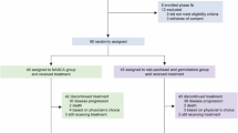 A total of 253 cycles of chemotherapy were administered and the median number of cycles was 2 (range: 1–6). In all, 90 patients in both arms were evaluable for toxicity. The data toxicity of four patients were missing. The most common side effects are shown in Table 2. Both chemotherapy regimens were well tolerated. The principal differences between the two regimens were grade 1 and 2 mucositis (arm A/B: 14 vs 29%) and diarrhoea (4 vs 20%). One patient in the combination arm had grade 4 thrombocytopenia. There were no treatment-related deaths.