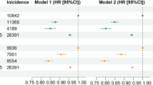 Table 4 shows cancer hazards ratios (95% confidence intervals) by MD score, overall and by sex. In comparison to those with poor MD adherence (score 0–3), those with intermediate (score 4–5) and high (score 6–9) adherence have progressively lower incidence of cancer overall. Excluding the first year of follow-up has essentially no effect on the estimates. In a continuous assessment, improved adherence by two points is associated with a highly significant (P-value=0.002) reduction in overall cancer incidence. The inverse association appears stronger among women, although the interaction by sex is not significant (P-value >0.50)