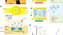 For preparation of organic memory from the poly (methyl methacrylate): poly (3-butylthiophene) with a graphene bottom electrode, poly (3-butylthiophene) (10 mg, Sigma-Aldrich, St Louis, MO, USA) was first dissolved in chlorobenzene (0.5 ml) and then blended with poly (methyl methacrylate) (0.5 ml, 950k A4, Micro-Chem, Newton, MA, USA) with stirring at 50 °C for 1 day. Next, the prepared solution was then dropped on an as-prepared CVD-graphene/copper foil and allowed to rest for 10 min, and then the spin-coating process was performed at a rate of 2500 r.p.m. for 20 s. After drying under reduced pressure, the polymer-coated CVD-graphene/Cu foil was immersed into a copper etchant, for example, an aqueous solution of iron nitrate (Fe(NO3)3) (0.05 g ml−1), for ∼4 h to etch the sacrificial copper foil. The poly (methyl methacrylate): poly (3-butylthiophene)/graphene film was subsequently transferred to a deionized water bath to wash away the copper etchant and was then transferred onto the pre-strained PDMS substrate. After drying naturally, 300-nm aluminum electrodes were thermally deposited onto the top of polymer layer in circular patterns. Finally, after carefully removing the clamps, the resultant devices spontaneously contracted and buckled on the released PDMS substrates.