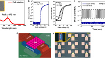 Figures 1a and b show the three-dimensional (3D) scheme of the PbS QD/IGZO hybrid phototransistor and the corresponding cross-sectional high-resolution transmission electron microscopy images, respectively. The Mo-gate electrode, the SiO2 dielectric layer, the IGZO channel and the PbS QD layers comprising the phototransistor were clearly observed. As can be seen in the magnified transmission electron microscopy images with the red and yellow dotted line squares, the PbS film consisted of numerous PbS QDs with an average diameter of 4–5 nm, which were uniformly distributed on the IGZO layer, with the PbS QD layer thickness estimated to be ~6.5 nm from transmission electron microscopy results.