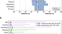 The combination of drugs was well-tolerated in most patients at the tested doses. None of the first three patients enrolled at dose level 1 exhibited DLT, and therefore patient four was escalated to dose level 2 (Table 1). We eventually enrolled a total of 10 patients to dose level 2. Three of these patients required replacement for DLT rate determinations owing to withdrawal from study before completing a cycle for nontoxicity reasons. Our first DLT occurred in the sixth evaluable patient, and we opted to enrol an additional three patients to confirm a DLT rate of ⩽33%. However, another DLT occurred in these additional patients, thus we de-escalated to dose level 1, enrolling an additional three patients to confirm the MTD. In summary, the rate of DLT at dose level 1 was one out of six patients, defining the MTD for the study at 50 mg twice daily selumetinib with cixutumumab 12 mg kg−1 every 2 weeks.