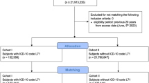 The NHS II began in 1989 when 116 430 US female nurses aged 25–42 years, completed a baseline questionnaire on medical history and lifestyle practices (Supplementary Information). Biennially, participants received a questionnaire and a response rate exceeding 90% has been achieved in the follow-up. Among participants with information on personal history of rosacea, we excluded those with missing date of birth, all cancers at baseline, and all non-whites, and 75 088 participants remained.