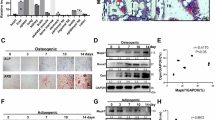 For histochemistry, immunohistochemistry and histomorphometric analysis, the femora were resected and fixed in phosphate-buffered saline (pH 7.4) containing 4% paraformaldehyde for 48 h, decalcified in 10% ethylenediamine tetraacetic acid (pH 7.0) for 14 days and embedded in paraffin. Four-μm-thick longitudinally oriented sections of bone including the metaphysis and diaphysis were processed for hematoxylin–eosin and immunohistochemical staining. For static histomorphometry, measurements of two-dimensional parameters of the trabecular bone were performed with OsteoMeasureXP Software (OsteoMetrics, Inc., Decatur, GA, USA). The sample area selected for calculation was a 1 mm2 area within the metaphyseal trabecular bone. All sections were observed on Olympus BX51 microscope (Olympus, Tokyo, Japan).