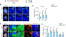 To study cell proliferation, OVs were incubated with 5-bromo-2′-deoxyuridine (BrdU; Sigma-Aldrich), a thymidine analog that is incorporated into DNA during the S phase of the cell cycle. BrdU (10 mg/ml) was added to the culture medium at different times as indicated (45 min, 1, 3 or 6 h) before the end of the incubation and its incorporation was detected with a specific antibody as above, but including a DNA denaturation step as recommended by the manufacturer (incubation in 50% (v/v) formamide-SSC, 40 min at 65 °C and in HCl 2 N, 30 min at 37 °C, with a wash for 10 min in pH 8 Tris 0.1 M). At least 5–6 OVs were assayed per condition in two independent experiments.