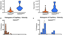 Prior to killing and tissue harvest, animals were injected retroorbitally with 100 μl Fluorescein-labeled Lycopersicon Esculentum (Tomato) Lectin solution (Vector laboratories) over 2 min. About 5 min after completion of the lectin injection, whole mouse brains were harvested after intracardiac perfusion with 4% paraformaldehyde in PBS. Tissue was then fixed overnight in 4% paraformaldehyde/PBS, embedded in paraffin, and mounted on glass slides in 10-μm thick sections. Prior to IHC, tissue was deparaffinized and antigen retrieval was performed in a pH 9 solution (DAKO) at 96 °C. To prevent non-specific staining, sections were incubated with 5% normal donkey serum in PBS prior to incubation with an anti-CD31 mAb (1:20, Dianova), followed by secondary detection with a fluorescent antibody (Jackson ImmunoResearch). All image analyses were performed using ImageJ software. In brief, CD31-positive images were thresholded using an automatic ImageJ thresholding function, binary images generated, and CD31+ vessel ROIs (region of interests) generated. For MVD measurements, this number was correlated with the analyzed tissue area to compute micro vessel density. Vessel diameter was analyzed by selectively measuring the Feret's diameter in only elongated vessels. For lectin measurements63, the CD31 ROIs were overlayed over binary images from the lectin channel. The area percentage of the lectin positive area in each vessel ROI was measured and the average lectin area per vessel was plotted using the prism software.