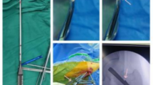 Patients were placed on a fracture table with an image intensifier and a C arm. Decompression was performed using a percutaneous approach with a 3-mm diameter trephine. The bone marrow was injected into the femoral head using a small trocar. The instrument was introduced through the greater trochanter, as in conventional core decompression. Its position in the femoral head and in the necrotic segment was monitored with fluoroscopy. Typically, two or three holes were made. The preoperative magnetic resonance imaging scans and image intensifier views were used together to determine the site of the lesion because, at the time of treatment, the plain radiographs showed little, if any, evidence of necrosis. To prevent leakage of the marrow, fibrin glue was subsequently injected.