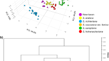 Rare alleles that were observed in a single individual were excluded from analysis. Significant deviations from Hardy–Weinberg equilibrium and the presence of possible null alleles (specific non-detected alleles) were tested across loci and populations using GenAlex v6.1 (Peakall and Smouse, 2006) and Microchecker v2.2.0.3 (Van Oosterhout et al., 2004). To compare molecular genetic diversity between species, allelic richness (Rs) and expected heterozygosity (He) were calculated for each marker class (SSRs, EST SSRs, indels and allozymes) and corrected for sample size differences by rarefaction and data bootstrapping, respectively, for unbiased molecular diversity comparisons using Microsatellite Analyser Software (MSA v4.05; Dieringer and Schlötterer, 2003). Molecular genetic differentiation was investigated by measuring patterns of allele sharing between species using GenAlex v6.1 (Peakall and Smouse, 2006) and by measuring paired-species differentiation values (Fst and Fst’ corrected for different marker diversities) and their 95% confidence intervals following bootstrapping using MSA v4.05 (Dieringer and Schlötterer, 2003). The influence of marker type (SSRs, EST SSRs, indels or allozymes) on patterns of differentiation was tested by comparing divergence measured for each marker type separately. Genotype data were used in a principal coordinate analysis and also a discriminant coordinate analysis of an absolute genetic distance matrix to discriminate between S. aethnensis, S. chrysanthemifolius, S. squalidus and Sicilian hybrid samples using the ade4 package in R v2.9 software (Dray and Dufour 2007; R Development Core Team 2009). Percentage variance explained was calculated from eigenvalues. The effectiveness of the first and second principal coordinates and discriminant scores at explaining paired-species differences was assessed by one-way analysis of variance after Bonferroni correction for multiple tests (three species pairs multiplied by two principal coordinates) using R v2.9 (R Development Core Team 2009). In addition, the influence of high, medium and low marker diversity on discriminant coordinate analysis results was investigated by analyzing different marker types separately divided into SSRs, EST SSRs, and combined indels and allozymes, respectively. Multivariate analysis of variance of the first two discriminant scores was used to assess the effectiveness of each marker class at discriminating between S. aethnensis, S. chrysanthemifolius, S. squalidus and Sicilian hybrid samples using R v2.9 (R Development Core Team 2009).