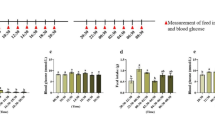 Immediately following the 9-day feeding regimes, mice were singly housed in wire-bottom cages and fasted for 10 h. Tails were nicked and baseline plasma glucose measurements were taken using a Freestyle glucometer (Therasense, Alameda, CA, USA). Animals were injected intraperitoneally with 10% d-glucose (0.01 ml g−1). Plasma glucose levels were measured at 15, 30, 60, 90 and 120 min after injection. Tails were cauterized after each test. The area under the curve (AUC) was calculated from glucose tolerance tests results to quantify glucose responses.