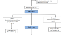 Infants eligible for this prospective, randomized blinded trial were between 27 and 30 completed weeks of gestation, older than 1 week of age and tolerating 100 ml kg−1 per day of enteral feedings. The control group was treated with 2.2 mg kg−1 per day of ferrous sulfate and the treatment group was treated with 3 to 12 mg kg−1 per day based on the ZnPP/H. Infants had follow-up with Bayley exams at 6 and 24 months corrected age. Statistical evaluation included Student’s t-tests and Fisher’s exact test.