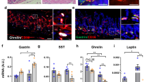 We examined the temporal expression pattern of RegI in the HCl/ethanol-treated mice. We found that the expression of the transgene in the stomachs of Tg mice was upregulated in response to HCl/ethanol administration, as well as the expression of the endogenous regI gene in the stomachs of Wt mice (Figure 5). This was an unexpected result because transgene expression was driven by an artificial promoter based on a human CMV (hCMV) promoter sequence, not by the endogenous regI promoter that responds to inflammatory stimuli. However, we found a clear answer to this issue in previous reports.24, 25 Those reports described the responsiveness of the hCMV promoter to various inflammatory cytokines including IL-1β and TNF-α. In addition, it is reported that those cytokines are produced from inflammatory sites, functioning as inflammatory mediators in the process of gastric ulcer healing.13, 26, 27, 28 Taken together, it is reasonable to speculate that these inflammatory cytokines were secreted from the site of the injury and delivered to the cells located around the ulcerated craters, resulting in the activation of the Tg promoter (hCMV promoter). We confirmed that these cytokine genes are indeed upregulated in Tg stomachs in response to HCl/ethanol administration (Figure 5c). We also examined spatial expression pattern of RegI in Tg stomach. Unexpectedly again, the Tg RegI expression was mainly directed to the ECL cells, which is the site of expression for endogenous RegI (Figure 5d). The mechanism for this is unclear and should be clarified in future studies. We speculate that there may be a post-transcriptional control mechanism specific to ECL cells, by which the regI mRNA molecule is efficiently translated into RegI protein.