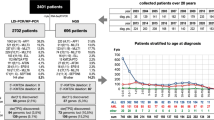 On the basis of the above distribution, about 96% of all ALL patients (n=1420) were characterized by the fusion genes MLL–AF4 (~57%), MLL–ENL (~18%), MLL–AF9 (~13%), MLL–AF10 (~4%), MLL–EPS15 (~2%) and MLL–AF6 (~2%). About 83% of all AML patients (n=872) were characterized by the fusion genes MLL–AF9 (~30%), MLL–AF10 (~16%), MLL–ELL (~11%), MLL PTDs (~12%), MLL–AF6 (~8%), MLL–ENL (~4%) and MLL–SEPT6 (~2%). These results are in line with recently published data about the frequency and distribution of different MLL fusion partner genes.16, 17, 18 This updated information is quite important for diagnosis and has already been used to establish a fast reverse-transcription PCR-based multiplex screening method.19 Additional information about the distribution of translocation partner genes (TPGs) in major disease subgroups (different B-cell developmental stages, T-ALL or French–American–British (FAB) M0–M7 for AML patients) have been summarized in Supplementary Figures S1 and S2. Here the different FAB classes in AML show a quite distinct pattern of fusion genes with some of the major fusion partners missing in distinct FAB groups M0–M7. For example, in FAB M0 AF4 and ELL are missing, in FAB M1 ENL is missing, in FAB M2 AF4, AF10 and AF6 are missing and so on. In FAB class M6 and M7, only certain fusion genes could be identified. In B-ALL stages, no such exclusion patterns were observed, rather a shift for specific fusion genes, while T-ALL is mainly composed of ENL and AF6 gene fusions (see also below).