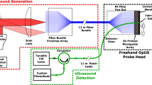 In terms of imaging depths and spatial resolutions, the all-optical ultrasound transducer used in this study performed favorably with respect to electronic counterparts with broadly comparable frequency ranges that provided forward visualizations from the distal ends of needles and catheters29, 30, 31, 32, 33. For instance, Chiang et al.30 integrated an electronic transducer with a diameter of 0.5 mm and a center frequency of 40 MHz (−6 dB fractional bandwidth of 50%) into an epidural needle and reported an imaging depth of 10 mm in soft-tissue in vivo and an axial resolution of 150 μm. Similarly, in Wright et al.29, forward-viewing catheters (3.3 mm outer diameter; 10 F) with single transducers that were operated in the frequency range of 25–33 MHz allowed for the intracardiac visualization of myocardial tissues to depths of 5–10 mm in vivo. With all-optical ultrasound transducers, optimizations for biological tissues could readily be performed in ways that are not possible with electronic transducers. As optical ultrasound transmitters are non-resonant, the central frequency of transmitted ultrasound can be varied by changing the pulse duration of excitation light. The same transmitter can thus provide both low-frequency, high-depth imaging and high-frequency, low-depth imaging6. Likewise, the responsiveness, sensitivity and directionality of a Fabry–Pérot ultrasound receiver can be altered by changing the shape and thickness of the cavity15.