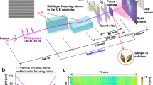 To characterize the diffraction efficiencies and wavefront aberrations of the MLLs and to form images using the lenses, we used beamlines P11 (Refs. 24, 25) at the PETRA III synchrotron radiation facility (DESY, Hamburg) and the Hard X-ray Nanoprobe (HXN) beamline at the National Synchrotron Light Source II (NSLS-II) of Brookhaven National Laboratory (NY, USA)26, 27. At both these facilities, we used a scanning microscopy geometry, whereby a monochromatized collimated beam was focused by the lenses to illuminate a spot on the sample that was scanned in its transverse position. At the HXN beamline, where we used a slightly modified test system to accommodate our MLLs, a portion of the monochromatized beam was selected by an aperture placed in the secondary source of the beamline, approximately 8 m upstream of the lenses, to achieve a spatial coherence length matched to the width of the lenses. Each lens in its mount was attached to an independent and motorized stage with both translational and rotational degrees of freedom with linear and angular resolutions of approximately 0.1 μm and 5 μrad, respectively28, 29. The lenses were mounted to focus in the horizontal and vertical directions. The far-field diffractions from the lenses alone and with the sample in place were recorded using a pixel-array detector. At P11, this was a LAMBDA 750 K detector (X-Spectrum) placed 1.4 m downstream from the focus. This had 512 × 1536 pixels with an individual pixel width of 55 μm, which was monitored in real time using the OnDa software package30. At HXN, a Timepix detector (512 × 512 pixels, 55 μm width) was placed 0.533 m downstream of the focus. The general scheme is depicted in Figure 3.