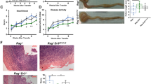 Induction of chronic colitis and treatment. C57BL/6J mice were purchased from the Jackson Laboratory (Bar Harbor, ME). Chronic DSS colitis using four cycles of 2.5% DSS in drinking water was performed as described.10 In the adoptive transfer model, colitis was induced by intraperitoneal injection of 500,000 CD4+CD45RBhi naïve T cells isolated from WT mice to Rag1−/− mice. Hamster anti-mouse Tl1a Ab (12F6A, TEVA, North Wales, PA) that specifically blocked the function of Tl1a but did not mediate depletion of activated T cells (data not shown) was used. For the adoptive transfer model, Tl1a Ab or control immunoglobulin G (Leinco Technologies, St Louis, MO) was injected into mice intraperitoneally twice per week beginning on day 29 (Figure 1a, left panel). For the chronic DSS model, Tl1a Ab or control IgG Ab was injected intraperitonealy twice per week beginning on day 15 (Figure 1a, right panel). Baseline controls (Rag Co or WT Co) were mice analyzed before DSS treatment or adoptive transfer of naïve T cells. Pre-treatment (Pre-Tx) controls were mice analyzed at day 14 for the chronic DSS model and day 28 for the adoptive transfer model. Treatment groups were mice analyzed at day 28 for the chronic DSS model and at day 56 for the adoptive transfer model (Figure 1a). All mice were maintained under specific pathogen-free conditions in the Animal Facility at Cedars-Sinai Medical Center (CSMC, Los Angeles, CA). This study was carried out in strict accordance with the Guide for the Care and Use of Laboratory Animals of the National Institutes of Health. Animal studies were approved by the CSMC Animal Care and Use Committee (protocol 3813).