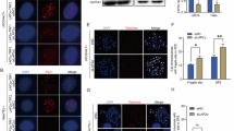 The slides were imaged using Nikon 50i epifluorescence microscope equipped with X-Cite series 120 illuminator (EXFO Photonics Solutions Inc., Ontario, CA, USA) and a 100 × /1.4 NA oil immersion Neofluar lens. Fluorescence excitation/emission filters were as follows: Cy3 excitation, 546 nm/10 nm BP; emission, 578 nm LP (Carl Zeiss Inc.); DAPI excitation, 330 nm; emission, 400 nm through an XF02 fluorescence set (Omega Optical, Brattleboro, VT); Alexa Fluor 488 excitation, 475 nm; emission, 535 nm through a combination of 475RDF40 and 535RDF45 filters (Omega Optical). Grayscale images were captured for presentation using Nikon NIS-Elements software and an attached Photometrics CoolsnapEZ digital camera, pseudo-colored and merged. Integration times typically ranged from 500 to 800 ms for Cy3 (telomere) and FITC (centromere) signal capture, 50 to 100 ms for the DAPI counterstain, and 100 to 200 ms for Alexa Fluor 488-conjugated antibodies.