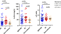 In this study, IgG4 myeloma represented 4% (6/158) of the IgG myeloma cases. The frequency of IgG4 myeloma correlates with the normal distribution of the IgG4 isoform (3–6% of IgG in healthy subjects). Studies of subclass distribution in IgG monoclonal gammopathy of undetermined significance and myeloma have last been performed in the 1980s and showed similar data, with IgG4 representing 2–8% of IgG plasma cell neoplasms.36, 37, 38, 39 All patients in this study had persistently high levels of IgG4 paraprotein (average, 2.4 g/dl). Two patients had a documented phase of monoclonal gammopathy of undetermined significance and smoldering myeloma. Based on the current knowledge of myeloma biology, it can be assumed that the remaining patients also had a prodromal asymptomatic stage with gradually increasing levels of IgG4 paraprotein. Clinical course of plasma cell myeloma is characterized by disease relapses and exacerbations with fluctuating levels of paraprotein. Thus, we hypothesized that patients with IgG4 myeloma may offer an opportunity to study the long-term effects of high-concentration of serum IgG4.