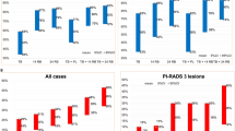 When all cases (pure and mixed) were included in the analysis, 63 (4%) cases were identified. Fifteen (24%) cases had upgrade, 3 invasive lobular carcinoma, 10 ductal carcinoma in situ, and 2 invasive carcinoma of no special type. There were 29 (46%) ALH, 31 (49%) LCIS, and 3 (5%) PLCIS. The rate of upgrade in these groups was 4 (13%), 9 (29%), and 2 (67%), respectively. The median patient age was 52 (range 38–79) years. There was no statistically significant difference with regard to age, menopausal status, MRI finding (mass vs non-mass), clinical indication for MRI, type of upgrade (invasive lobular carcinoma vs invasive carcinoma of no special type/ductal carcinoma in situ) or history of breast cancer (Table 2).