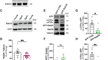β-Cleaved carboxy-terminal fragment of APP (βCTF) activates rab5 on endosomes and increases endosome size. (a) Rab5 activation, reflected by the rate of fluorescence recovery after photobleaching (FRAP), is measured as the rate at which photobleached GTP-bound rab5 (activated rab5) on individual endosomes is replaced by fluorescent cytosolic GDP-rab5 (inactive rab5). The rate of FRAP for endosomal GFP-rab5 is significantly decreased when βCTF levels are increased by overexpressing wild-type APP (APPwt) in N2a cells (N2a APPwt) or blocking βCTF cleavage with a 10 μm γ-secretase inhibitor L685 458 (N2a+L685), as compared with control cells expressing βCTF at endogenous levels (N2a) or transfected with an APP mutant construct unable to be cleaved to βCTF (N2a APPmv). The FRAP rate after transfecting a dominant-active mutant GFP-rab5 Q79L25 as a positive control is extremely reduced, indicating persistent rab5 activation. The summary graph reflects by the percent of average fluorescence recovery at 270 s after photobleaching in each condition (n=20 endosomes, one endosome per cell, total 20 cells, mean±s.e.m., one-way analysis of variance (ANOVA), Tukey’s test, ***P<0.001). (b) βCTF activates rab5 in human embryonic kidney 293 (HEK293) cells. APPwt overexpression increases the levels of active rab5 (GTP-bound rab5) detected with a GTP-rab5-specific antibody (first lane), whereas APPmv mutant has no effect (second lane), as compared with untransfected control (ctrl) cells (third lane). A bar graph presents mean immunoreactive GTP-rab5 signal±s.e.m. for three separate immunoblot experiments (representative blot shown) (**P<0.01, one-way ANOVA, Tukey’s test). Ten percent of cell lysates is used as total rab5. (c) βCTF induces endosomal enlargement in N2a cells. Cross-sectional area of rab5-positive endosomes is increased by APPwt overexpression or 10μM L685 458 (lanes 2 and 3), which raise αCTF and βCTF levels compared with those in ctrl cells (lane 1). APPmv mutant expression elevates αCTF levels but not βCTF levels (lane 4) and does not enlarge endosomes. Each graph bar indicates the number of measured endosomes from 20 cells (*P<0.05 and **P<0.01, respectively, mean±s.e.m., one-way ANOVA, Tukey’s test).