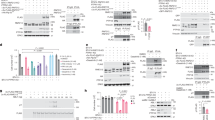 a, Western blot analysis of p40phox, p47phox and p67phox in the lysates of BMDMs from WT and NRROS-deficient (KO) mice either unprimed (–) or primed (+) with IFN-γ. Actin used as loading control. b, c, phospho-p47phox (P-p47phox) and total p47phox (b), active Rac and total Rac (c) in IFN-γ-primed BMDMs stimulated with zymosan for the indicated time. Active Rac was immuoprecipitated and blotted. Total Rac in the lysates used as control. d, e, Taqman analysis of Cyba (p22phox) (d) and Cybb (NOX2) (e) expression in total RNA from BMDMs either primed with IFN-γ or left alone (Unprime). Expression levels were normalized to endogenous control, ribosomal protein L19 (Rpl19) (n = 3). f–h, Top panels, NOX2 and p22phox expression in thioglycollate-elicited peritoneal macrophages (f), in splenocytes from mice infected with L. monocytogenes for 24 h (g) and in total CNS cells from EAE-induced mice on day 15 post-immunization (h). Bottom panels, densitometry analyses relative to actin (n = 3). Error bars, s.e.m. *P < 0.05, **P < 0.01 (unpaired Student’s t-test). Data are representative of three (a–c) and two (f–h) independent experiments.
