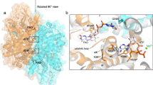 a, UV-visible absorption features of alpha HODM (8.5 μM). Ferric (thick solid line), ferrous (thin solid line) Fe2+–O2 (dotted line) and Fe2+–CO (dashed line). The major (Soret) absorption band is centred at 409, 423, 418 and 421 nm, respectively. The α/β bands are magnified in the inset. b, Titration of ferric and ferrous-oxy HODM α subunit with DMA. Absorbance changes associated with the haem Soret peak are plotted as a function of DMA concentration. The data are fitted using a hyperbolic function or the Morrison equation. Top, ferric with Kd = 12.6 ± 0.2 mM. Bottom, ferrous-oxy with Kd = 41.0 ± 5.0 μM (errors bars are s.e.m., n = 3). Insets show UV-vis spectra of the titration of DMA (0–50 mM) against ferric and ferrous-oxy HODM α subunit (7.5/4.8 μM). The UV-vis spectrum of α in buffer A was recorded initially and then after each addition of DMA. The direction of the absorbance changes of the ferric and ferrous-oxy Soret peak on substrate addition is measured from 409/415 nm (thick line) to 416/414 nm (dotted line), respectively. c–e, Spectral properties of HODM haem subunit variants E266Q, W180A and R224A, respectively. Ferric (thick black line), ferric in presence of 1 mM DMA (thick grey line), ferrous (thin black line), ferrous in presence of 1 mM DMA (thin grey line) and Fe2+–O2 (dotted line). The α/β bands are magnified in the inset. While the E226Q variant lacks spectroscopic features associated with DMA binding, the R224A variant appears to bind DMA as a 6th ligand to the haem iron in the ferrous state. Oxygen binding can be detected for all variants.