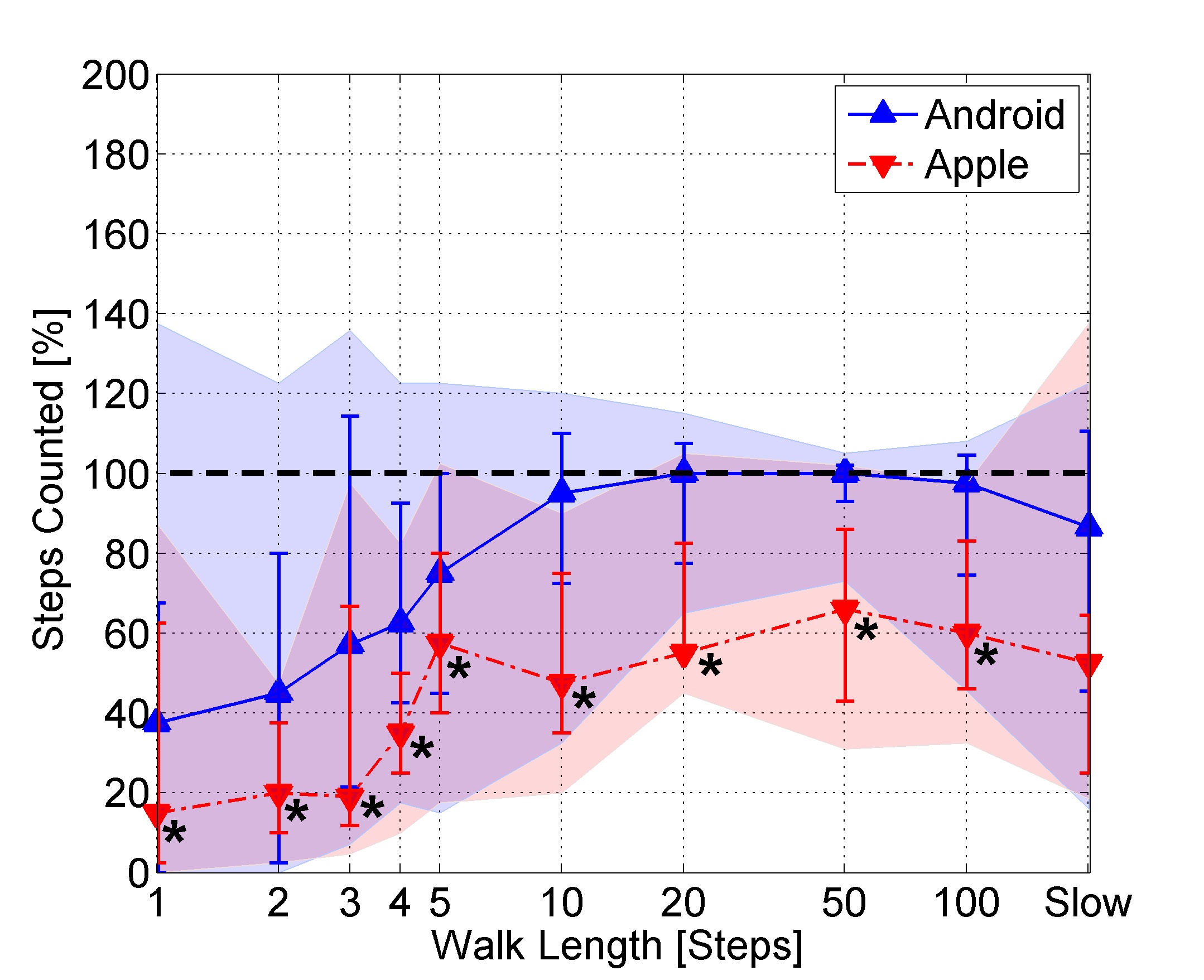 Recently a group of my students tested a version of the app used in this paper and found it to be far more inaccurate than we expected (between 0% and 200% of steps counted) - see a preliminary figure below: