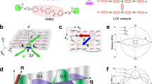 Photoalignment of an azobenzene dye (PAAD-22, Beam Co.) was used to pattern director orientation in liquid crystal cells. Methods used here were previously described17. Briefly, plasma-cleaned glass slides were coated with the photosensitive dye using spin coating from a 0.33-wt% solution in dimethylformamide. The glass was then baked for 10 min at 100 °C to remove remaining solvent. Sets of two dye coated glass slides (38 × 25 mm2) were then exposed to point-by-point irradiation of linearly polarized 445 nm light over an area of 0.01 mm2. This step is then repeated across the sample using a custom-built optical patterning setup. The dye aligns perpendicularly to the electric field vector of the incoming light. These two patterned surfaces were then spin coated with a layer of RM 257 (Merck), which is subsequently polymerized to render the alignment permanent. These two slides are then aligned and glued together using a two-part epoxy mixed with 50-μm-diameter glass spheres.