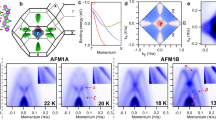 CeB6 crystallizes in a CsCl-type simple cubic crystal structure shown in Fig. 1a. The B6 octahedron is situated in a cubic environment of Ce atoms. In Fig. 1c–e, we present Fermi surface maps taken for different cleavage planes as indicated in the figure. The symmetry of the Fermi surface contours mirrors one of the cleavage plane. The (100) direction has a fourfold rotation axis, (110) only twofold and three- or sixfold for (111) depending on the used photon energy. The Fermi surface consists of ellipsoids centred at the X point. Figure 1f–h present 3D visualizations including the experimental cuts shown above. This Fermi surface agrees with previous measurements for CeB6 (refs 27, 28, 29, 30). The ellipsoids are typical for the hexaborides in general28,29. Their orbital character is composed of extended Ce 5d states with admixtures of localized Ce 4f near the Fermi energy (EF; ref. 28), similar to other 4f systems exhibiting a resonance mode31,32.