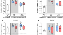 Human iPSCs (hiPSCs) were chondrogenically differentiated to produce hiPSC-derived cartilaginous particles as described previously38. The hiPSCs were transferred and then maintained in a feeder-free medium, Essential 8 (Invitrogen) with 50 units ml−1 penicillin and 50 mg ml streptomycin, in 3.5-cm Matrigel-coated dishes. The hiPSCs formed high-density cell colonies which consisted of 1–2 × 105 cells 10–15 days after the start of maintenance under the feeder-free culture conditions. Subsequently, the chondrogenic differentiation of iPSCs was performed. The hiPSCs were initially differentiated into mesendodermal cells in DMEM/F12 (Sigma) with 10 ng ml−1 of Wnt3A (R&D), 10 ng ml−1 of Activin A (R&D), 1% ITS, 1% FBS and 50 units and 50 mg ml−1 of penicillin and streptomycin, respectively for 3 days. On day 3, the medium was changed to the basal medium (DMEM with 1% ITS, 1% FBS, 2 mM L-glutamine (Invitrogen), 1 × 10−4 M nonessential amino acids (Invitrogen), 1 mM Na pyruvate (Invitrogen), 50 units of penicillin and 50 mg ml−1 of streptomycin) supplemented with 50 μg ml−1 of ascorbic acid, 10 ng ml−1 of BMP2, 10 ng ml−1 of TGF-β1 and 10 ng ml−1 of GDF5, which was intended to commit the cells to the chondrocytic lineage. A total of 10 ng ml−1 of bFGF (WAKO) was added to the chondrogenic medium from day 3 to day 14 to increase the cell proliferation. Chondrogenic cells form multilayered nodules by day 14. The nodules were physically separated from the bottom of the dishes to form particles, which were then transferred to a suspension culture in 3.5-cm petri dishes on day 14. The cells in the particles produce cartilaginous extracellular matrix, resulting in the particles becoming cartilaginous tissue in suspension culture. The culture medium was changed every 2–7 days. The hiPSC-derived cartilaginous particles on day 56 were cultured in the hypertrophic medium in the presence or absence of 300 μM pterosin B for 4 weeks.