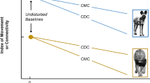 Identification or size of captured prey species could not be inferred from logged movement data of dogs in this study. However, in this population21, as well as the two other most-studied African wild dog populations, more than 80% of prey are the most abundant medium-sized antelope species9,17. Since impala are the predominant prey in our study area and considering the time of the study (April–October), this would give a possible variation in impala size between 20 and 60 kg at the beginning of the study (juvenile–large adult male) and subadult to adult by the end. Prey of this size can feed multiple dogs up to a certain pack size with little or no diminishing returns to any individual21. Therefore, in our pack, the benefits derived from group hunting described by Creel and Creel6 and Fanshawe and Fitzgibbon10 can be explained simply by additive opportunistic capture frequency, as expected when more dogs chase multiple individual prey, and feed cooperatively.