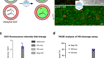 Having ascertained that Mg2+ transit across OA/GMOA membranes was rapid and free Mg2+ was present within these vesicles, we examined the functionality of an encapsulated hammerhead ribozyme19,20. This ribozyme exhibits Mg2+-promoted catalytic function. Consistent with the presence of free Mg2+ within these vesicles, a reaction containing 1 μM of each ribozyme component and 15 mM MgCl2 exhibited a rate constant of 0.24 h−1 in OA/GMO vesicles and 0.25 h−1 in OA/GMOA vesicles—comparable between lipid systems and somewhat lower than the vesicle-free rate constant of 0.50 h−1 (Fig. 2).