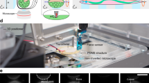 The glass slide, with the attached microfluidic channel and piezoelectric transducer, was mounted on an inverted optical microscope stage (TE-2000U, Nikon, Japan). Microparticles, cells and C. elegans were infused into the channel through a 1-ml syringe (309659, Becton Dickinson, USA) by automated syringe pumps (Nemesys, Cetoni, Germany). Once the microbubbles were trapped via surface tension effect, the transducer was connected to a function generator to control the microbubble activation using a sine wave produced by a function generator (AFG 3011, Tektronix, USA). The driving voltages used in the experiments were 2–20 VPP. The working frequency for the rotational manipulation was adjusted by sweeping the frequency.