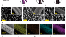 We also used XPS to determine the oxidation state of Mo in SL and ESD electrodes. Figure 5a–c shows Mo 3d XPS spectra of SL- CNT, ESD-NaPOM-CNT, ESD-NH4POM-CNT and ESD-HPOM-CNT. All Mo 3d XPS spectra exhibit the characteristic 3d5/2 and 3d3/2 doublet caused by spin–orbit coupling of the Mo 3d orbitals. Deconvolution of all Mo 3d XPS spectra with a fixed intensity area ratio of 2:3 (corresponding to d orbital60,61) reveals two peaks for each Mo 3d5/2 and Mo 3d3/2 spin–orbit coupling. The peaks located at 232.0 eV/235.1 eV and 233.1 eV/236.2 eV in Mo (3d5/2/3d3/2) spectra correspond to Mo5+ and Mo6+, respectively, which is in agreement with literature values62,63,64. In addition, the characteristic binding energy separation (Δ Mo 3d) between the Mo 3d5/2 and 3d3/2 doublet of Mo5+ and Mo6+ is ∼3.1 eV as observed previously in the literature for Mo5+ and Mo6+ ions65. These XPS observations show that similar oxidation states of POM clusters on CNT are present following SL and ESD. The calculated area % of different Mo chemical states post XPS analysis of all Mo 3d spectra are reported in Table 1. The area % of Mo5+ and Mo6+ in both Mo 3d5/2 and 3d3/2 of the SL-CNT and ESD-NaPOM-CNT are similar indicating that the charge state of Mo is not affected in both cases. However, a slightly higher abundance of Mo6+ seen in the ESD-NH4POM-CNT may be due to charge (e−) transfer from POM to NH4+ (NH4+ is a Lewis acid). In addition, the C 1s spectra of different CNT electrodes were also examined, but no significant changes were observed (see Supplementary Fig. 16).
