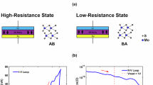 We design solid-state FTJs based on these ultrathin films of PVDF. As sketched in Fig. 2a, the junction size is defined by patterning the bottom electrode of W into pillars with 190 nm diameters isolated by a SiO2 matrix. The PVDF ultrathin films are then deposited on this template. Finally, micron-size top electrodes are deposited by Au evaporation and standard photolithography (see the ‘Methods’ section). Figure 2b shows typical current–voltage (I–V) characteristics of 1L and 2Ls PVDF FTJs. A hysteresis in the current is observed for both thicknesses. For the 1L PVDF FTJ, the current switches from the OFF resistance state to the ON resistance state (that is, from small to large current flow, respectively) when sweeping the voltage on Au from +1.5 V to −1.5 V. It switches back to the ‘off’ state when sweeping the voltage from −1.5 V to +1.5 V. A similar behaviour is observed for the 2Ls PVDF FTJ within a voltage window of ±2 V. The dispersion from one FTJ to another is very small as emphasized in Fig. 2b.