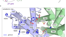 The eukaryotic NSS are also Cl−-dependent6,7,10,11,12, which is released with Na+ and substrate on the intracellular side, whereas the bacterial transporters use a negatively charged residue, for example, Glu290 in LeuT13,14,15,16, which most likely is also the site of H+ counter-transport in the inward-to-outward transition14,15,16. Some eukaryotic NSSs, such as the serotonin transporter (SERT) counter-transport K+ but can also accept H+ (ref. 17). Notably, the inward-to-outward return is rate limiting for the overall transport rate of SERT18 supporting the notion that this transition is particularly challenging.