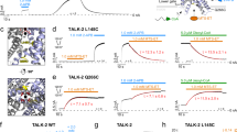 All single-channel recording and analysis experiments were carried out using Port-a-Patch patch clamp system (Nanion Technologies GmbH, Munich, Germany). Planar lipid bilayers were obtained from GUVs prepared by using the electroformation method55 in an indium tin oxide (ITO) coated glass chamber connected to the Nanion Vesicle Prep Pro setup (Nanion Technologies GmbH, Munich, Germany). A mixture of 10 mM DPhPC (2-diphytanoyl-sn-glycero-3-Phosphocholine, Avanti Polar Lipids Inc.) and 1 mM cholesterol, dissolved in chloroform, was deposited on the ITO-coated glass surface and air-dried. After complete evaporation of the solvent, the lipid film was rehydrated with 210 μl of 1 M sorbitol. GUVs were formed by electroswelling using an alternating electric field of amplitude 3 V, 5 Hz for 2 h. GUVs were collected and used directly for the reconstitution of the ion channel. Purified chymotrypsin-treated NaKTs channel was reconstituted into the GUVs solution to a final concentration of 40 μg ml−1. Giga-ohmic seals were formed within a few seconds by pipetting 5 μl of the protein-GUVs on the micro-structured glass patch clamp NPC-1 Chips by Nanion. Channel activity was recorded under symmetric conditions (unless otherwise stated) using 20 mM HEPES, pH 7.5, 0.2 M NaCl/KCl as the internal solution and 20 mM MOPS, pH 4, 0.2 M NaCl/KCl, as the external solution. The channel is active only at pH 4 (MOPS & HEPES); no current was detected at pH 7.5 (HEPES). The data were filtered at 3 kHz (Bessel filter, HEKA amplifier) digitized at a sampling rate of 50 kHz and analyzed with ClampFit (Axon Instruments, part of Molecular Devices, USA). Ionic currents were observed only after adding Ca2+ in the external solution. All I/V curves were determined using a voltage sweep procedure in which the membrane potential was changed from −40 to +40 mV in steps of 20 mV lasting 20 μs. Open-channel probability was measured as a function of Ca2+ concentration, with internal solution containing 20 mM HEPES, pH 7.5, 0.2 M NaCl and the external solution containing 20 mM MOPS, pH 4, 0.2 M NaCl. External CaCl2 was applied using a multichannel perfusion system linked to the Port-a-Patch. The membrane potential was held at −40 mV and the current recordings were measured using CaCl2 concentrations of 1, 2, 3, 4, 5, 7.5, 10, 12.5 and 15 mM. Single-channel currents were recorded from multiple patches for 1–3 min per Ca2+ concentration using continuous acquisition mode. The Po were calculated as the fraction of open time over a total time interval during which there is channel activity. For each Ca2+ concentration, about 3–5 separate time intervals of ∼200 ms were analyzed and the error on the Po was estimated as the mean-square deviation from the average. Single-channel recordings on the chimeric NaKTs-SFKcsA channel were carried out according to the same procedure.