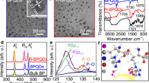 As a new member of 2D materials, atomically thin black phosphorus (BP) has many potential applications in electronics and optoelectronics23,24,25,26,27,28,29,30,31. Being a metal-free layered semiconductor, BP has a layer-dependent direct bandgap varying from 0.3 eV for the bulk materials to 2.0 eV for phosphorene (monolayered BP), thereby allowing broad absorption across the ultraviolet and infrared regions25. Liquid exfoliation methods are commonly utilized to prepare BP nanosheets with different thicknesses and sizes32,33,34,35,36 for bioimaging and phototherapy37,38,39. In particular, ultrasmall BP nanosheets (also called BP quantum dots, BPQDs) with a size of ∼3 nm have a large NIR extinction coefficient, high photothermal conversion efficiency and little cytotoxicity39. As an inorganic nanoagent, BP is attractive due to its inherent biocompatibility and furthermore, as one of the vital elements, P is a benign element making up ∼1% of the total body weight as a bone constituent in the human body40,41,42. Recent experiments have shown that BP nanosheets, especially ones with a small thickness and size, have high reactivity with oxygen and water43,44,45,46 and can degrade in aqueous media. Moreover, the final degradation products are nontoxic phosphate and phosphonate45,46,47, both of which exist in and are well tolerated by the human body41,42. Therefore, ultrasmall BPQDs with good photothermal performance and biocompatibility are potential therapeutic agents. However, their actual clinical application in vivo still suffers from rapid renal excretion and degradation of the optical properties during circulation in the body.