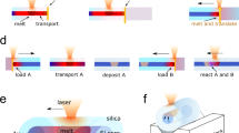 The heating of the glass to melt the core and the high temperatures attained allow structuring of the glass cladding as well as the core. In Fig. 5h, we illustrate one advantage of CO2 laser processing over a laser with a wavelength absorbed by the core; the softened fibres can be tapered to reduce the core diameter to a few μm. Similar tapers have been used to observe non-linear optical effects in silicon fibres60. We believe that cores down to 1 μm can be readily obtained, and possibly single-mode fibres can be obtained if the core remains continuous during the drawing process.