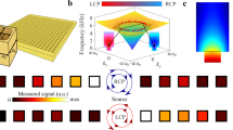 where t, w are the thickness and width of metal plates, p is the structural period. ω=2πf denotes the angular frequency of acoustic waves. Here, the refractive index of air nair=1 and the speed of sound in air at room temperature cair=343.21 m s−1. For the fabricated sample, the structural parameters are R=77.4 mm, w=17.2 mm, t=1.7 mm and P=4.3 mm. In stark contrast to the natural existing materials with refractive indices always lower than nair34, the extremely anisotropic metamaterial can support tightly guided acoustic waves, as the effective refractive index is much larger than nair. To suppress high-order guided modes, the operation frequency should satisfy the cutoff condition of ω<πcair/w.