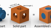 We note that similar fluid-like behaviours were theoretically shown to arise in two-dimensional systems via intricate hybridization of multipole local resonances37. However, the microstructure is highly complex, therefore, presents a tremendous fabrication challenge. The approach adopted here is much more convenient and practical. Dirac-cone dispersion in phononic crystals was also theoretically shown capable of similar characteristics44. Nevertheless, the system relies on a zero refractive index as well as accidental degeneracy, which imposes high requirement of system parameters, making it less robust against perturbations, and, therefore, is also difficult to realize. In addition, lattice constants in phononic crystals are at the same order of wavelength, whereas the lattice constant in our design is deep sub-wavelength. On the other hand, ‘pentamode’ metamaterials, essentially skeletons of elongated struts joint together at their tips so as to maintain rigidity, also demonstrated vastly different transverse and compressional elastic modulus14,16. These delicate structures are not fully solid, and require advanced fabrication techniques17,18,19. Existing experimental investigations focused more on their static mechanical properties15,16,17,18,45 and shock responses21.