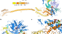 Crystals were flash-frozen in liquid nitrogen after cryo-protection by transfer into cryo-solution containing mother liquor and 20% (v/v) glycerol. Diffraction data were measured under cryogenic conditions (100 K; Oxford Cryosystems Cryostream) at the European Synchrotron Radiation Facility (ESRF, Grenoble). Data were processed with XDS (ref. 61). Phases were obtained by molecular replacement using PHASER (ref. 62) (search model 4b9q11) in the PHENIX software package63. Model building, refinement and validation were done using COOT (ref. 64), Phenix.refine65, REFMAC5 (ref. 66) and MOLPROBITY67, respectively. Figures were prepared in PyMOL (ref. 68) and UCSF-Chimera69. Electrostatic surface potentials were calculated with APBS and PDB2PQR (refs 70, 71, 72) integrated in PyMOL (ref. 68). Sequence alignments were performed using Clustal Omega73 and visualized with ESPript 3.0 (ref. 74) ( http://espript.ibcp.fr/ESPript/ESPript/). Protein sequence conservations were analysed using the ConSURF server75,76.