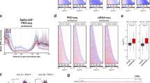 Interestingly, we found a twofold increase in the abundance of SRATs in the wild-type histone shuffle strain (YBL) when compared to the BY4741 wild-type S cerevisiae strain (Supplementary Fig. 4B). This increase in abundance of transcripts in the wild-type histone shuffle strain leads to more muted fold-change values compared with the BY4741 strain (Supplementary Fig. 4C). Comparing the fold-change in the SET2 mutant with that of the H3K36A mutant for each individual SRAT in a scatter plot revealed this bias more clearly (Supplementary Fig. 4D). However, plotting the abundance of each SRAT between the two mutant strains show a comparable increase in both cases (Pearson’s coefficient of correlation=0.75). We attribute this leaky expression of the antisense transcripts in the wild-type shuffle strain to the decreased copy number of the histone genes (one versus the usual two copies found in yeast). A recent publication also showed that decreasing the number of histone copies in yeast leads to a slight alteration in nucleosome distribution28. However, the H3K36A mutant recapitulates the abundance of SRATs to a level similar to the SET2 deletion mutant, suggesting that the initiation of transcription in these mutants occurs similarly.