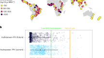 The development of cost and environmental footprint over the period 1975–2015 is shown in Fig. 2. Within this period, with an installed capacity increase from less than 1 MWp to almost 180 GWp, prices dropped from almost 100 USD per Wp to around 0.64–0.67 USD per Wp at the end of 2014. Data for environmental footprint of PV systems do not go back that far, and furthermore show a less clear trend over time. Still, especially for energy pay-back time (which is calculated from reported system CED according to the procedure described in the Methods section) a clear decrease of environmental footprint over time can be observed. Energy pay-back times drop from around 5 years in 1992 to around just under 1 year for poly-Si and just over 1 year for mono-Si PV systems currently8. Greenhouse gas emissions from photovoltaics, expressed in grams of CO2-equivalent per kilowatt-hour (gCO2-eq kWh−1), show large variations, even for studies analysing PV systems from the same year. This large variation is likely due to a variety of approaches in calculating the GHG emissions. More recent studies seem to use more congruent methods, resulting in a smaller variation of calculated GHG footprint. The current GHG footprint (harmonized data) is around 20 gCO2-eq kWh−1 for poly-Si PV systems, and around 25 gCO2-eq kWh−1 for mono-Si PV systems8, down from 143 gCO2-eq kWh−1 for poly-Si in 1992 (ref. 19) and 409 gCO2-eq kWh−1 for mono-Si in 1986 (ref. 20). For determining the EPBT and the GHG footprint per kWh of produced electricity, the energy yield of the systems, and thus insolation and consequently location, are of great importance. The values here refer to standardised conditions: insolation of 1,700 kWh m−1y−1 and a performance ratio (PR) of 0.75, based on methodology guidelines from21. Recent meta-analyses of LCA studies on crystalline PV systems established average values for environmental footprint of PV systems, and found energy payback times to be 3.1 and 4.1 years for poly and mono-Si, respectively22, based on studies conducted between 2005 and 2013. In a recent study Ferroni and Hopkirk23 presented figures for energy return on energy invested that are equivalent to energy payback times that were much higher compared to what is found in other recent studies, or even much older studies. The study was not well received within the PV research community (M. Raugei, personal communication), and was found to severely lack in the applied methodology. For instance, the authors strongly overestimated the energy required for PV production, and at the same time underestimated the energy yield and lifetime of PV systems. Another meta-analysis found GHG emissions to be 44.3 and 79.5 gCO2-eq kWh−1 for poly and mono-Si, respectively, based on studies from 2004 to 2014 (ref. 24). Comparing this to the values mentioned earlier, that were reported for current PV systems by Wetzel8, we see that the developments in the past decade have been so significant that the GHG footprint of state-of-the-art poly and monocrystalline silicon based PV systems is already 55 to 69% lower, respectively, compared to the averages of roughly the last decade (2004–2014) mentioned at the beginning of this paragraph.