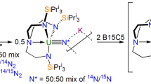 The few methods of preparing isolable uranium nitrides30,31,32,33,34,35,36,37,38,39,40,41 contrast to the plethora of methods in the transition metal series46,47, and for uranium most involve redox activity of azide. In this work, we have found new and reliable methods to a wide family of terminal uranium nitrides based on the U(TrenTIPS) framework (Supplementary Note 2), and it is our hope that this could be applicable to other ligand systems. We note that the reactivity described here is analogous to that reported recently for a titanium nitride59, since uranium is behaving like an early d-block ion in this context.