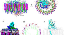 Purified RC/YFP–LH1 complexes were adsorbed onto the pre-coated carbon film on a copper grid and negatively stained; Fig. 3a shows typical raw data with some single particles showing an additional density, indicated by white arrows in the inset to Fig. 3a. Then 11,777 particles were selected for further analysis; Fig. 3b shows examples of averaged reference-free 2D classes and Fig. 3c,d shows the reconstructed model of the RC/YFP–LH1 complex viewed from the cytoplasmic side of the membrane and in the plane of the membrane, respectively. This model is based on half of the structure of the dimeric RC–LH1–PufX core complex29,30; the extra density apparent in some of the single particles and image classes and seen in the final reconstruction arises from YFP, which clearly protrudes from the side of the complex.