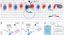 The depth-holding M-AUE swarm acted as a 2D sensing array, enabling accurate detection and quantification of the underlying flows. In particular, the swarm can resolve the wave direction, phase speed, amplitude or the presence of multiple waves with different properties. The wavelength, frequency and phase speed of the dominant (onshore-propagating) waves were diagnosed from cross-correlations of temperature fluctuations in time and space among the M-AUEs (Supplementary Fig. 2). A model of depth-holding objects in a linear internal wave in a linear density gradient25 parameterized with these data gave excellent agreement with the changes observed in the M-AUE swarm (Fig. 5). The simple linear theory explained 92% of the observed temperature variance and 88% of the variance of the M-AUE concentration during the 40-min period shown in Fig. 5.