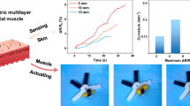 The hydraulic hydrogel actuators were designed based on previously reported soft actuators (Supplementary Fig. 2)4,5,22,24. The moulds for each parts were fabricated using 3D printer (Form2; Formlabs) and laser cutter (Epilog Mini/Helix; Epilog Laser) based on computer-aided design drawings generated from commercial 3D modelling software (Solidworks; Dassault Systems). Each hydrogel parts were prepared by physically crosslinking hydrogels using the moulds. Physically crosslinked hydrogels were fabricated by pouring pre-gel solution into the moulds and covering glass plates. The pre-gel solution for the soft PAAm-alginate tough hydrogel was prepared by mixing carefully degassed aqueous solution (22.2 wt.% AAm, 1.5 wt.% sodium alginate, 0.02 wt.% MBAA, 0.2 wt.% Irgacure 2959, 2.2 wt.% glucose and 0.01 wt.% glucose oxidase) with ionic crosslinkers (calcium sulfate slurry with final concentration of 20 × 10−3 M in crosslinked hydrogel). The pre-gel solution for the stiff PAAm-alginate tough hydrogel was prepared by mixing carefully degassed aqueous solution (22.2 wt.% AAm, 3 wt.% sodium alginate, 0.02 wt.% MBAA, 0.2 wt.% Irgacure 2959, 2.2 wt.% glucose and 0.01 wt.% glucose oxidase) with ionic crosslinkers (calcium sulfate slurry with final concentration of 60 × 10−3 M in crosslinked hydrogel). The physically crosslinked hydrogels in the moulds were kept in a humid chamber for 1 h to make sure the formation of physical crosslinks. Thereafter, the physically crosslinked hydrogel parts were carefully separated from the moulds and assembled each other together with hydraulic connections (for example, elastomeric tubings). Elastomeric tubings were treated with benzophenone solution (10 wt.% in ethanol) for 2 min at the room temperature (23 °C) to form robust interface with hydrogel27. Treated elastomeric tubings were washed with methanol three times and completely dried with nitrogen gas before being assembled with the physically crosslinked hydrogel parts.